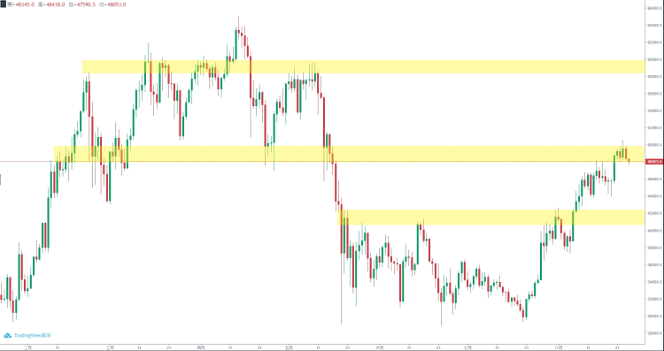 從六月幣價修正期間,我們就不斷提到巨鯨大戶一直逢低加碼收集籌碼。根據研究機構Chainalysis數據顯示巨鯨今年以來的動向,這些大戶在年初時便積極買進比特幣,當時幣價仍在三萬附近。到了三、四月開始進行調節,當時比特幣價格落在五萬五至六萬區間,代表散戶在此期間承接大戶的賣單。五月份幣價修正擴大後,持有比特幣不到一年的散戶錢包開始拋售,但巨鯨們卻在此時重新進場逢低承接,統計六月至八月二十二日數據,大戶總計已買進約一百億美元比特幣。