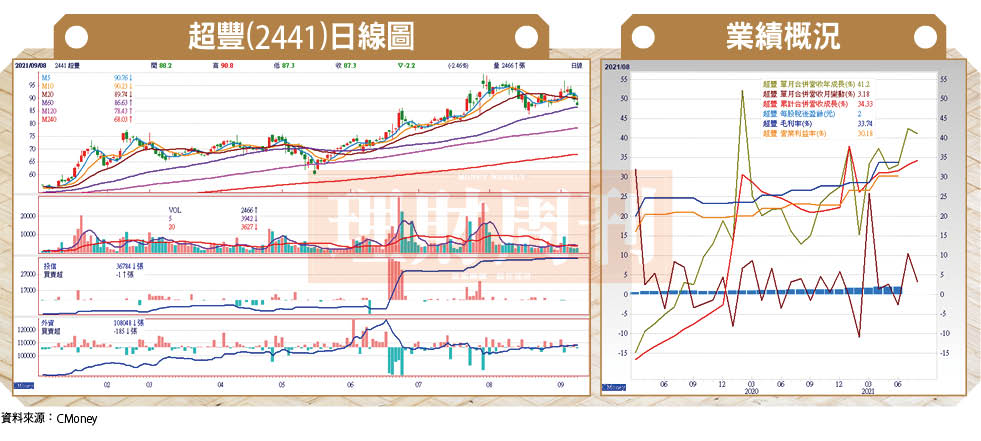 超豐儘管接連於五月份遭逢二次跳電、六月份碰上移工群聚染疫的影響,但第二季營收仍舊順利逆勢創高,連帶促成單季稅後淨利一一.三八億元,季增率二二.四%,年增率達七二.七%,成功連四季改寫新高,單季EPS二元亦創下新高;上半年稅後淨利二○.六八億元,年增率達七一.九%,上半年EPS三.六三元,亦雙雙創下同期新高紀錄。
