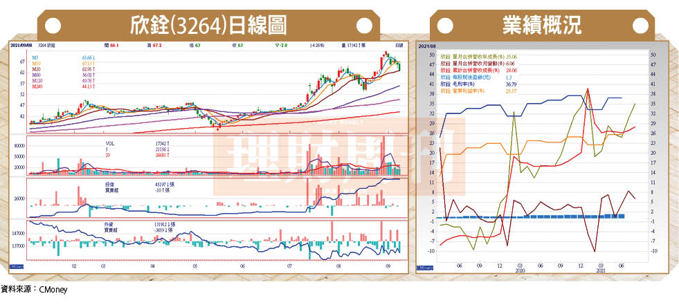 台灣晶圓測試專業廠欣銓(3264),主要業務為測試服務。其中,於晶圓測試市場占有率,位居台灣第三大廠。欣銓營收比晶圓測試七九%、成品測試二一%。公司產品線涵括範圍,由消費性IC等傳統PC相關客戶,擴增至電源、安控、車用防撞、通訊等四大IC板塊。