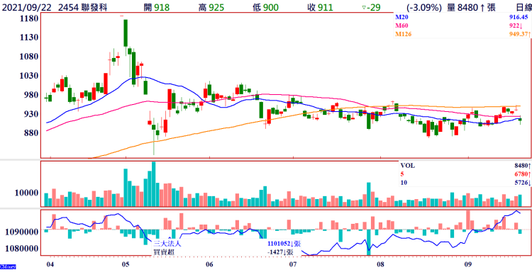聯發科股價今年五月創歷史新高1185元後開始震盪走低,回檔最低821元,最近五個月都在1000~865元間箱型震盪,9/22收盤價911元,以今年EPS 66元計算,本益比13倍,近期只要半年線壓力948元突破就會有新的多頭行情發動。九月以來外資累計買進超過二萬張,以均價925元計算合計買進184億元,是今年單月買進最多的一個月,可見外資作價企圖心強烈,近期花旗銀行調高目標價至1650元。