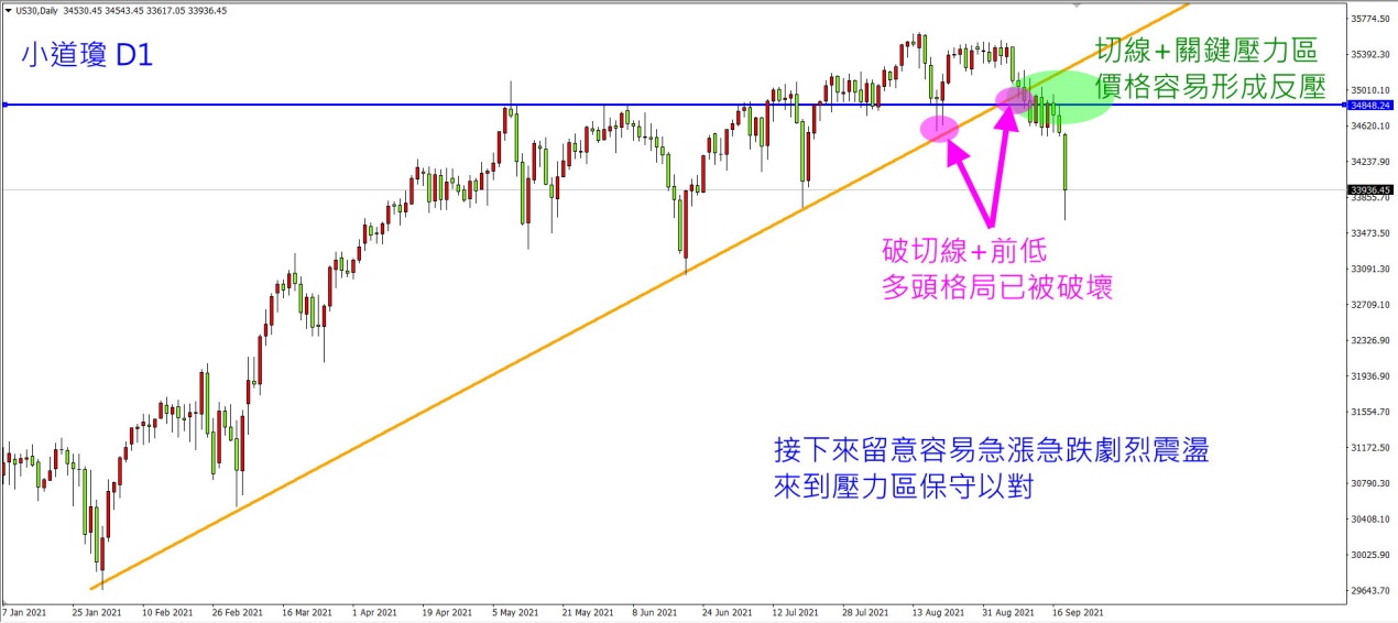無論恒大是否破產、美聯儲是否升息,就目前K線來看,美股已跌破上升趨勢線,多頭格局已被破壞,未來創新高難度偏高,建議保留現金空手以待,景氣循環是必然現象,即使量化寬鬆能解決一時困境,但延遲的循環會以另一種更棘手方式呈現,從小道瓊價格來看,未來幾個月將劇烈震盪,盤久必殺,投資人還須謹慎,反彈都視為出場點。