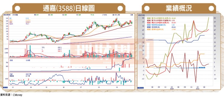通嘉USB-PD訂單持續喜獲滿載效應,同時也成功反映成本、調漲產品售價。法人機構預期,通嘉第三季營收業績將有望改寫單季歷史新高,全年獲利與二○二○年相較下,可望見到倍數成長;同時,此波訂單暢旺的熱市需求,看好將有望一路延續至二○二二年。