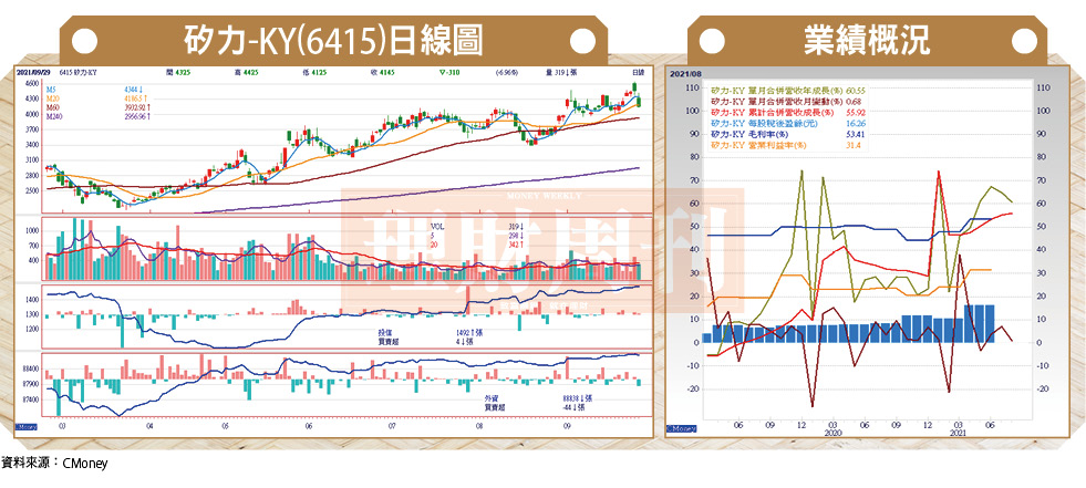 雖然消費性產品市場需求出現減弱跡象,但矽力-KY因受惠疫情後經濟逐漸復甦,因此帶動工業類產品拉貨力道增強,且下半年進入手機銷售傳統旺季,一○○W快充晶片出貨持續放量,第四季有望進入高峰。另一方面,伺服器下半年度出貨成長動能強勁,新能源車對電源管理晶片應用顆數量增,因而帶動車用業務營收走揚;矽力-KY近期股價表現,亦因反映基本面利多而創下新高。