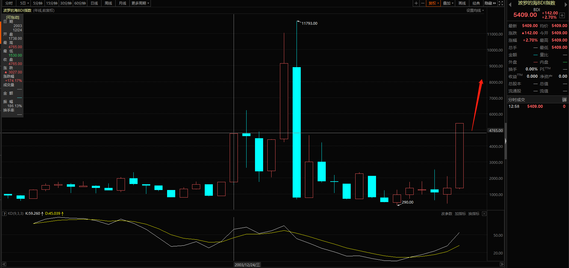 從年K線圖來看,當前的漲勢可媲美二○○三年起漲的大多頭行情,那次的多頭是架構在中國不計代價要辦成北京奧運會,如今的大多頭是建立在疫情造成缺櫃、缺船、碳中和的運力淘汰,所以短期不排除直接挑戰二○○四年的6208高點,中長期來看,中國出口集裝箱運價指數SCFI創歷史新高,不僅貨櫃輪企業租用散裝輪替補運力,現在就連企業(如可口可樂)也租用散裝輪來運送貨品,避免違約。
