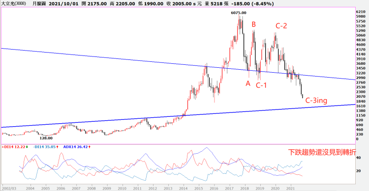 就算用簡單的頸線概念,3370元以上屬於頭部套牢區,照這樣看,低位的支撐線落在1600元附近,可能只是初步的探底過程,以上方三年的頭部規模,對照公司擴廠腳步不放鬆,估計轉折年可能落在2023-2024年,大立光要重返股王的地位,可能就要對玉晶光與舜宇光學祭出專利權官司,讓蘋果沒有其他廠商可選擇。