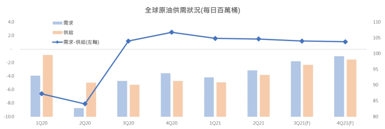 站在OPEC+的角度思考,除了擔心未來Delta病毒再次爆發的機率外,緩慢增產對他們來說,也是最保守、最能確保獲利不至於受突然的供給量衝擊的選擇。根據JPMorgan全球原油供需狀況來看,在OPEC+無意回應美國總統拜登的加速增產喊話,並維持原計畫的緩步增產步調下,今年第三季與第四季供需仍可維持在每日短缺120萬桶與110萬桶,全球原油市場供不應求狀況料將持續。