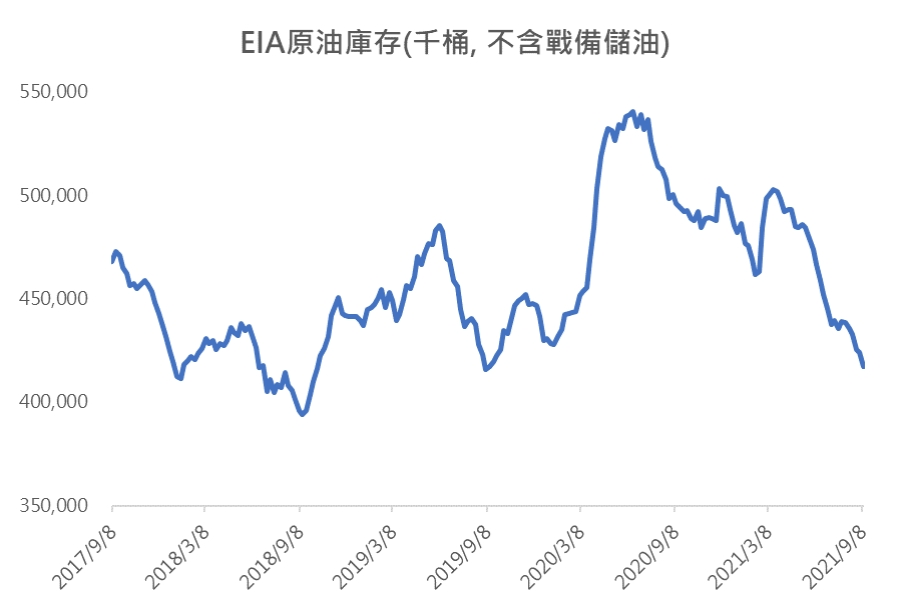 需求增溫也反映在庫存快速消耗上,根據美國原油庫存資料顯示,最新原油庫存為4.17億桶,相較去年疫情爆發後高點5.41億桶,已大幅減少達1.24億桶,甚至逼近2019年低點4.16億桶,代表美國自疫情恢復需求成長優於預期,也指出美國原油供給明顯不足,目前美國石油鑽井平台數僅回升至411座,仍低於疫情爆發前水準達40%,加上拜登的綠能政策不利於傳統石油企業拓展,最終原油庫存可望持續走低。