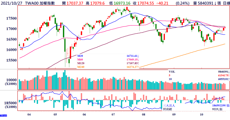 結果十月初在美國債務上限政府恐關門、通膨升溫債券殖利率攀升,以及中國恒大地產危機、中國限電…等美、中兩國諸多利空衝擊下,台股逼近年線支撐時,市場果然又恐慌下看15000~15500點,我們卻告知投資朋友年線上下找買點,短期進入年線上下至季線上下區間劇烈震盪,如今果然又反彈到季線17000點上下。