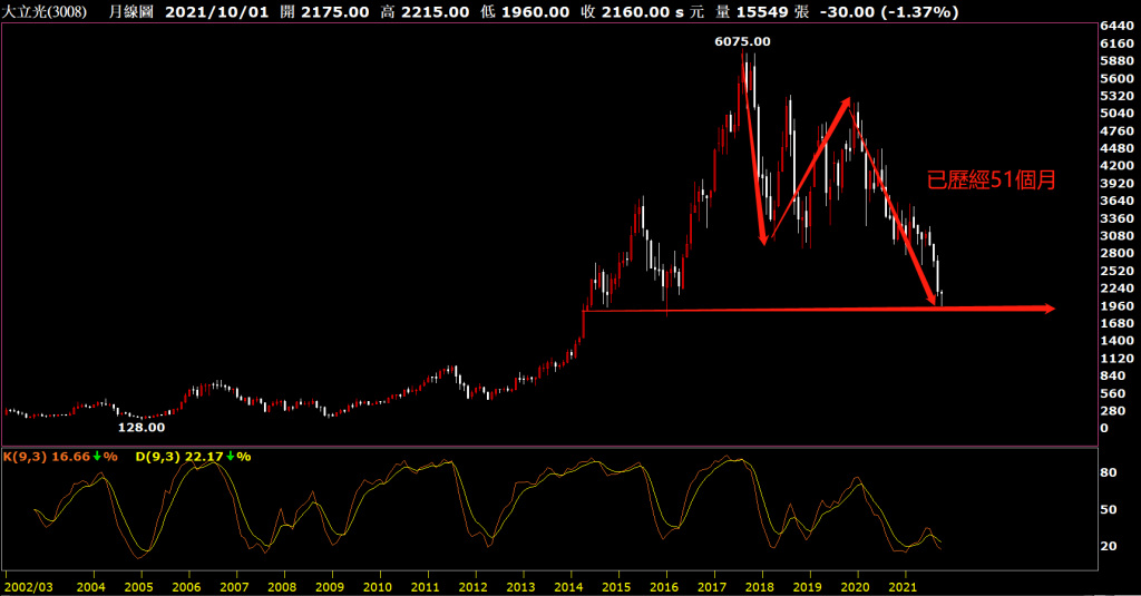 大立光自2017年八月的6075元高點拉回到2021年十月,已歷經五十一個月,再過四至五個月就滿足費氏數列的55,明年的iPhone 14改款較大,但還不一定是大立光業績回升的轉折點,參考大立光新廠落成時間在2023年,只能說2022年在庫藏股的支撐,進入築底模式,十月二十六日爆出2463張單日大量,但外資減碼713張,沒鎖住漲停板,但留下多方缺口,盤後公告買回庫藏股二百張,價格2161.33元,未來觀察重點在於二千元是否成為築底的鐵板區。