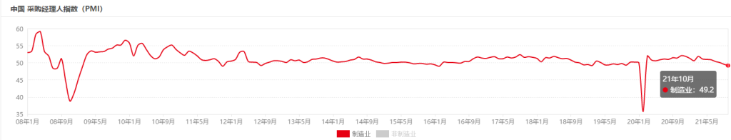 這一點從九至十月的中國製造業指數PMI連續下降可以得知,為了冬奧與不限電,積極打壓原物料上漲,使得今年GDP呈現開高走低的趨勢,說不定明年上半年延續經濟調整的節奏,全年呈現開低走高的模式,畢竟當前供應鏈瓶頸問題嚴重,積極拚經濟未必是件好事。