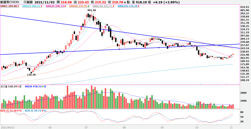 短期間二十日均線看似對貨櫃三雄形成壓力,但參考十月面板跌價的友達在四月底見高點,整理五個月之後,拉出長紅K站上年線,底部成形。