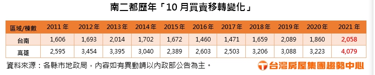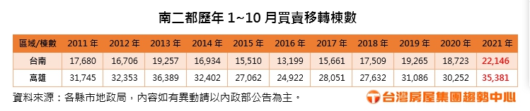 「數字會說話」!根據高雄市及台南市地政局所公布的今(二○二一)年十月及今年一至十月的房屋交易數字,可以讓人見識到南二都房市之成交,跟南部的天氣一樣「熱乎乎」。
