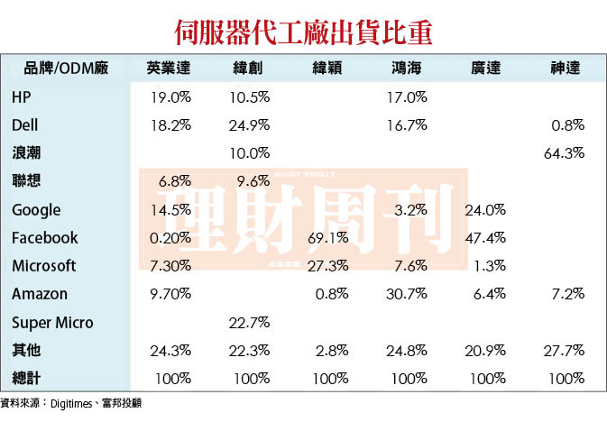 根據二○二二年雲端服務商資本支出可知,高成長的微軟、臉書及谷歌將創造伺服器的高需求,供貨給他們的伺服器代工廠營運也將會有高成長的表現。緯穎(6669)及廣達(2382)將會是主要受惠者,緯穎的伺服器出貨客戶中,微軟佔二七%、臉書佔六九%;廣達的伺服器出貨客戶中,臉書佔四七%、谷歌佔二四%。