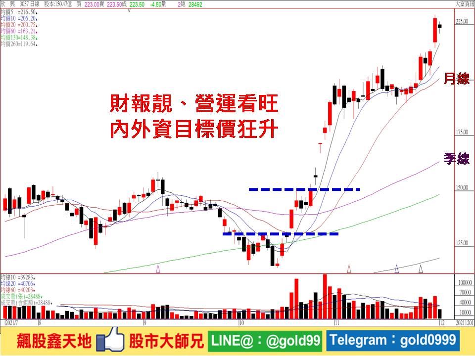 【操作建議】策略「低接不追高」原則不變,雖然欣興從10/14股價115元起漲以來,至近期來到229.5元為止,短短不到二個月時間大漲近一倍,不過,在短中長期均線持續呈現多頭排列向上,以及內外資法人大戶心態積極偏多不變下,只要量價不失控,並守穩十日線及月線等位置區不破,預期後市仍將有強彈續漲再創新高機會,逢低仍可持續留意(※基本面資料若有異動,依公開資訊觀測站最新訊息為主)。基於風險考量,設好停損停利(詳見附圖說明)。