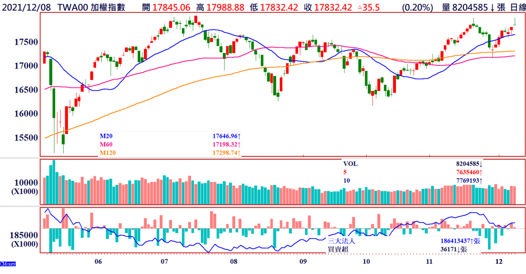 記得十一月二十六日因南非變種病毒Omicron加上美國恐加速縮表升息,台股大跌了284點,美股重挫九百點,當下我們就明確告知投資朋友,南非變種病毒只會影響短線,波段仍看漲到明(2022)年上半年。因為接下來除了十二月年底集團和法人作帳行情之外,現在到明年上半年還有炒夢行情,以及最重要的財報和高股息殖利率行情。