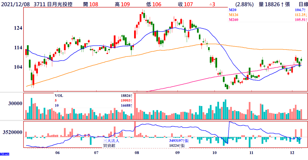 十一月六日公司宣布實施庫藏股買回5.5萬張,目前已執行買回超過五萬張,佔股本1%。每年第四季都是法人作帳季節,尤其法人高持股的公司股價都會有大漲的機會,日月光股價已站上年線105元,未來只要半年線112元再突破形成多頭排列,就會開始加速補漲。