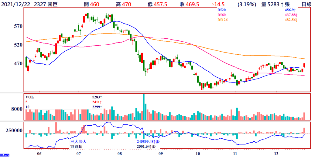 國巨今年股價最高644元,五月疫情爆發後一度跌到393元,十一月一度上漲至473元,最近三週維持箱形區間震盪(470~445元),近日又開始轉強落後補漲,12月22日外資買進2281張連買兩天,目前三大法人持股52.92%,法人高持股比例排行上市櫃第20名,是法人鎖碼股,年底法人作帳行情被拉抬機會很大。