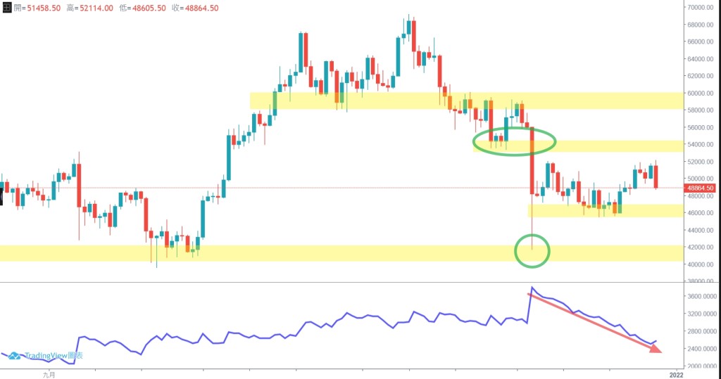 回到近期比特幣的走勢來觀察,先看技術面,從ATR來觀察不難發現幣價波動大幅收斂,價格也落在四萬六至五萬二的區間來回整理。接著從COT指數來觀察,比特幣期貨的淨多單從五千九百多減碼至四千九百口,目前觀察下來較偏向年底的部位調節,而非整體性的撤離。綜合觀察下來,短線先維持區間整理,只要能在五萬整數上方站穩,元月資金重回市場後,便有機會再帶動一波行情。