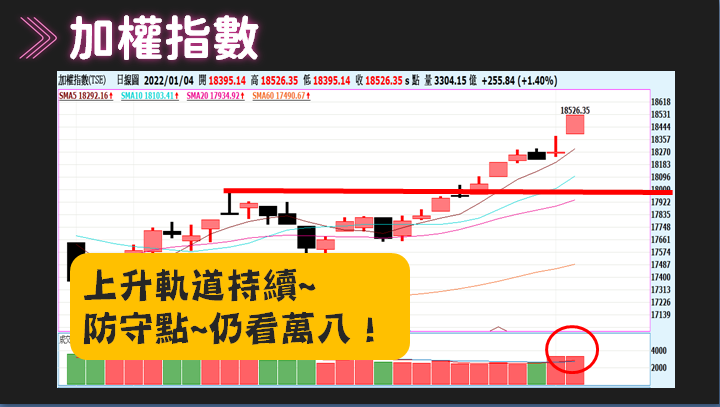 上期周刊提到,加權指數於2021/12/24順利改寫歷史新高,K棒高有過高,低沒破低,重新形成一上升軌道,後續只要三日價站穩18000,那萬八反壓區將會變成強而有力的支撐,這時的防守點位將從17600上移到萬八,我們可以適度的放大部位,只要萬八沒有跌破,行情就維持著偏多看待!