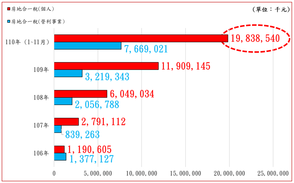 2020年下半年以來,政府為遏抑排隊買房等投機炒作行為,連續祭出四次選擇性信用管制措施,惟實際效果相當有限,房地價格仍持續呈現大幅飆漲情況;此可由房地合一稅實徵金額由2017年的25.68億元一路暴增至2021年(1-11月)的275.08億元,其中營利事業部分151.62億元,個人部分417.78億元(詳請參閱附表、附圖),兩者合計高達569.4億元,由此顯見除自然人投機炒作之外,法人機構短進短出之投機炒作亦是助長房價之元凶。