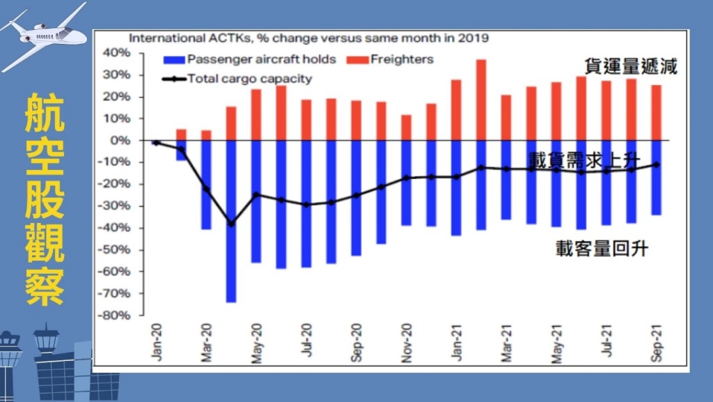 我們認為在海運報價持續向上且塞港問題仍難以解決的前提下,貨物將逐步由空運所取代,由附圖可以看到,空運運能有限,但空運需求持續上升,而客運部分也有機會在今年下半年開始回升,因此在運能排擠的影響之下,航空的客貨運預估都將走出不錯的向上走勢,股價表現也就可以期待。