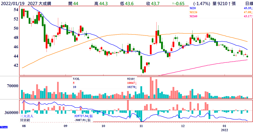 大成鋼去年股價一度達63.7元,最近半年持續下滑最低跌到40元,近兩月股價都處於40~50元底部震盪,1月19日收盤43.7元,本益比僅七倍。年線於43.1元形成底部支撐,未來只要50元頸線突破,有機會開啟一波新多頭。