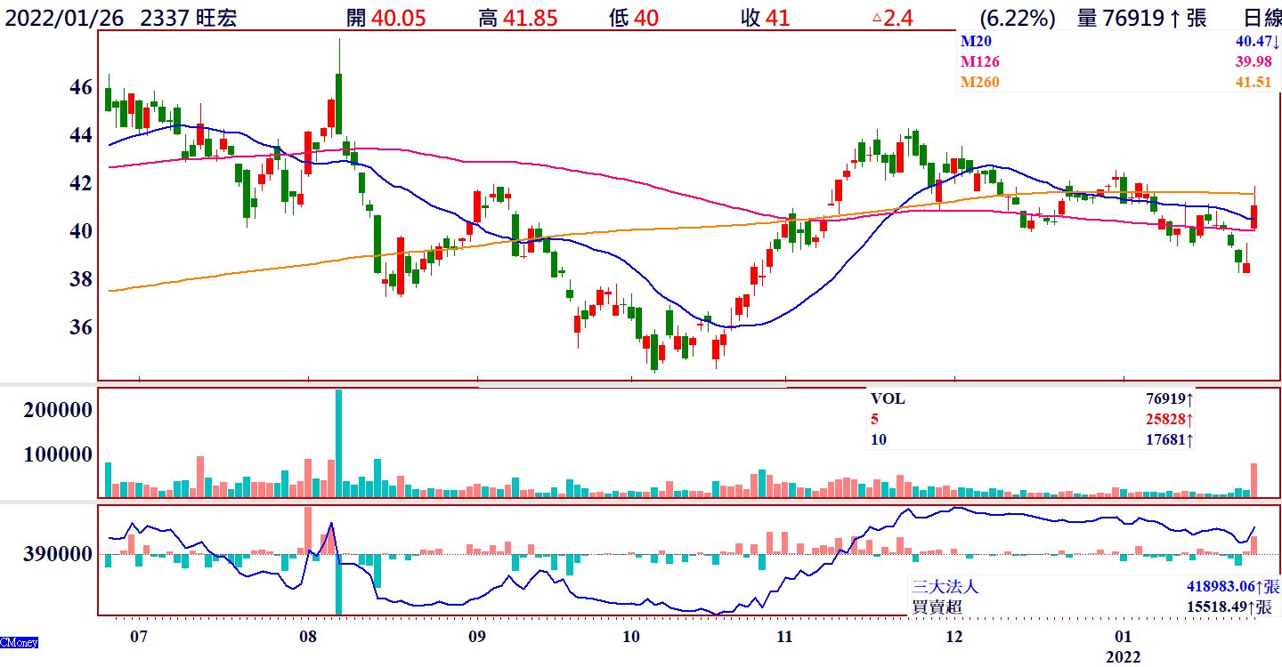 旺宏股價去年二月一度漲到50元,之後不斷震盪走低,十月最低到34元,第三季財報發佈後一度漲回44元,近兩個月又震盪壓回至38元,在年報發布後一月二十六日外資大買15064張,股價當日漲6.22%,目前月線40.67元、半年線40元、年線41.5元,未來只要股價站上42元均線會形成多頭排列,有機會開啟一波全新的多頭走勢,目前KD指標於29剛形成黃金交叉,也有利多頭發展。