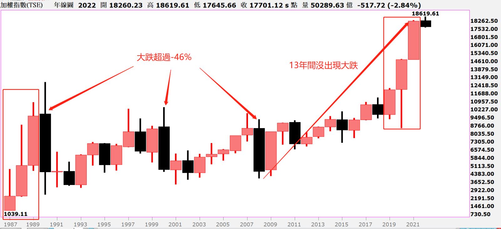 近代台股長多的起漲點是戒嚴之後的1987年1039點算起,在歷史上也就只有出現過兩次三年漲萬點,一次就是1987年的1039低點漲到1989年的10843高點,累積漲點達9804點,算上隔年的12682高點,累積漲點達11643點。另一次就是2019-2021的疫情期間8523低點漲到18619高點,累積漲點達10096點,時間相隔二十九年。