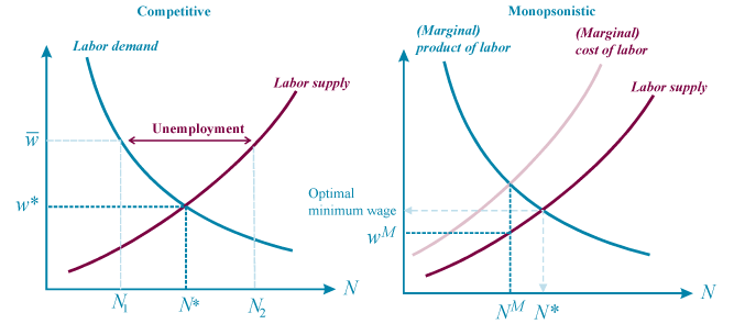 然而,獨買市場並非如此。附圖右方則是獨買市場的供需曲線。在一個獨買市場中,會有一個主導的雇主,因為它可能公司夠大、在市場中具有夠大的議價能力,或是由多間公司聯合起來一起行動,因此可以單方面決定工資。在右圖的狀況下,為了最大化收益,雇主聘僱人時會選擇「增聘員工的產量會等同增聘員工的成本」作為聘僱員工的數量。而這個數量所對應到的工資(wMNM),會比競爭市場均衡價量(w*N*)更低。