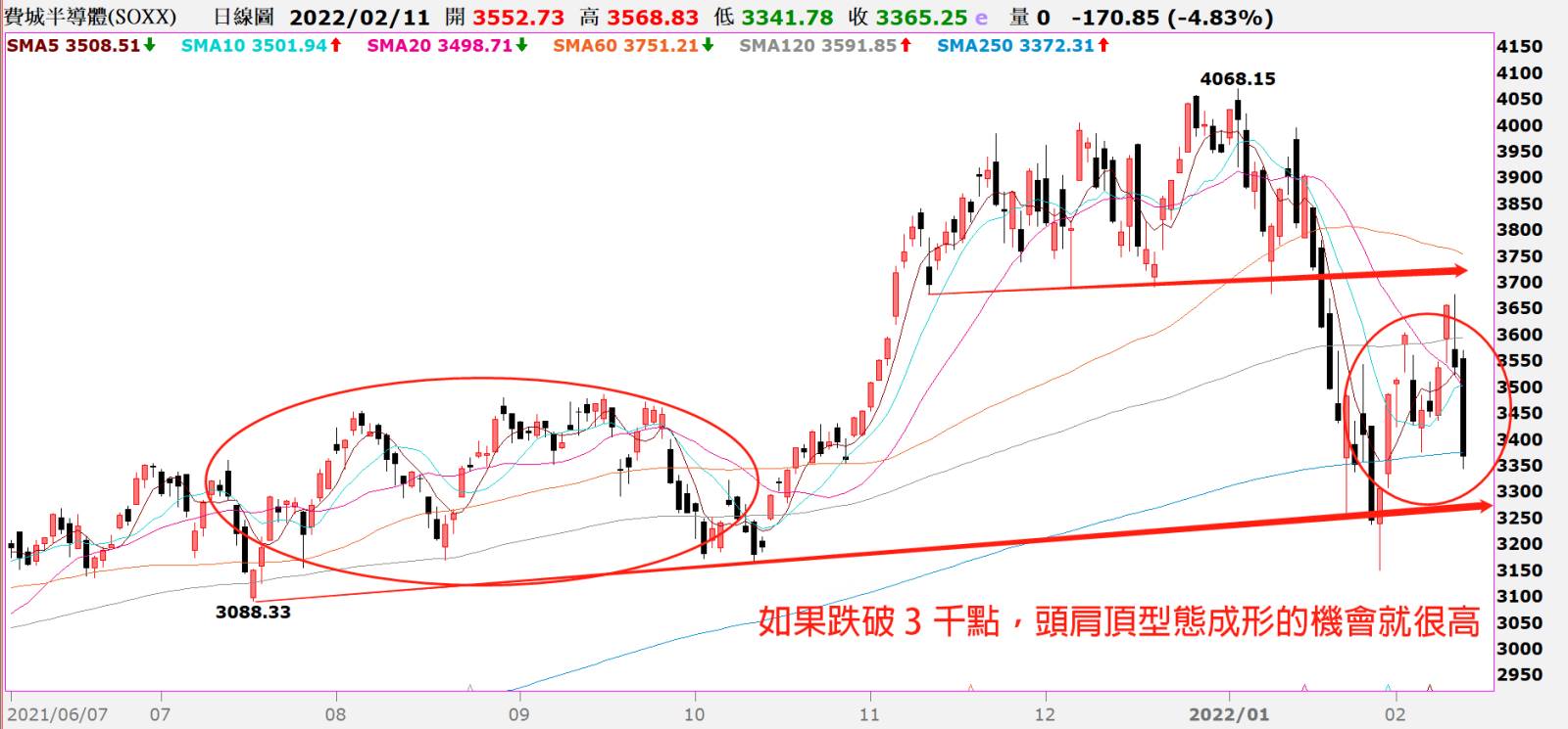 不過費城半導體指數在過年期間跌破年線3356點支撐,經過半個月的時間反彈,看起來似乎不敵半年線3591點壓力,這是頭肩頂的右肩嗎?