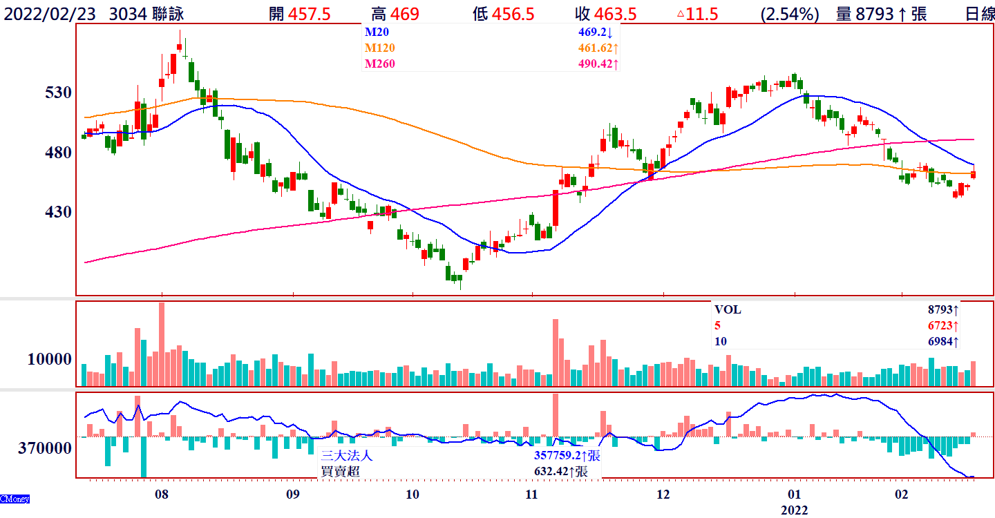 聯詠股價今年一月一度漲到546元,隨後開始下滑最低探441元,跌幅達20%,近期股價開始止跌回升,450~440元成為底部區,年線490元及500元是最大關卡,未來如果站上後就有加速補漲機會行情。