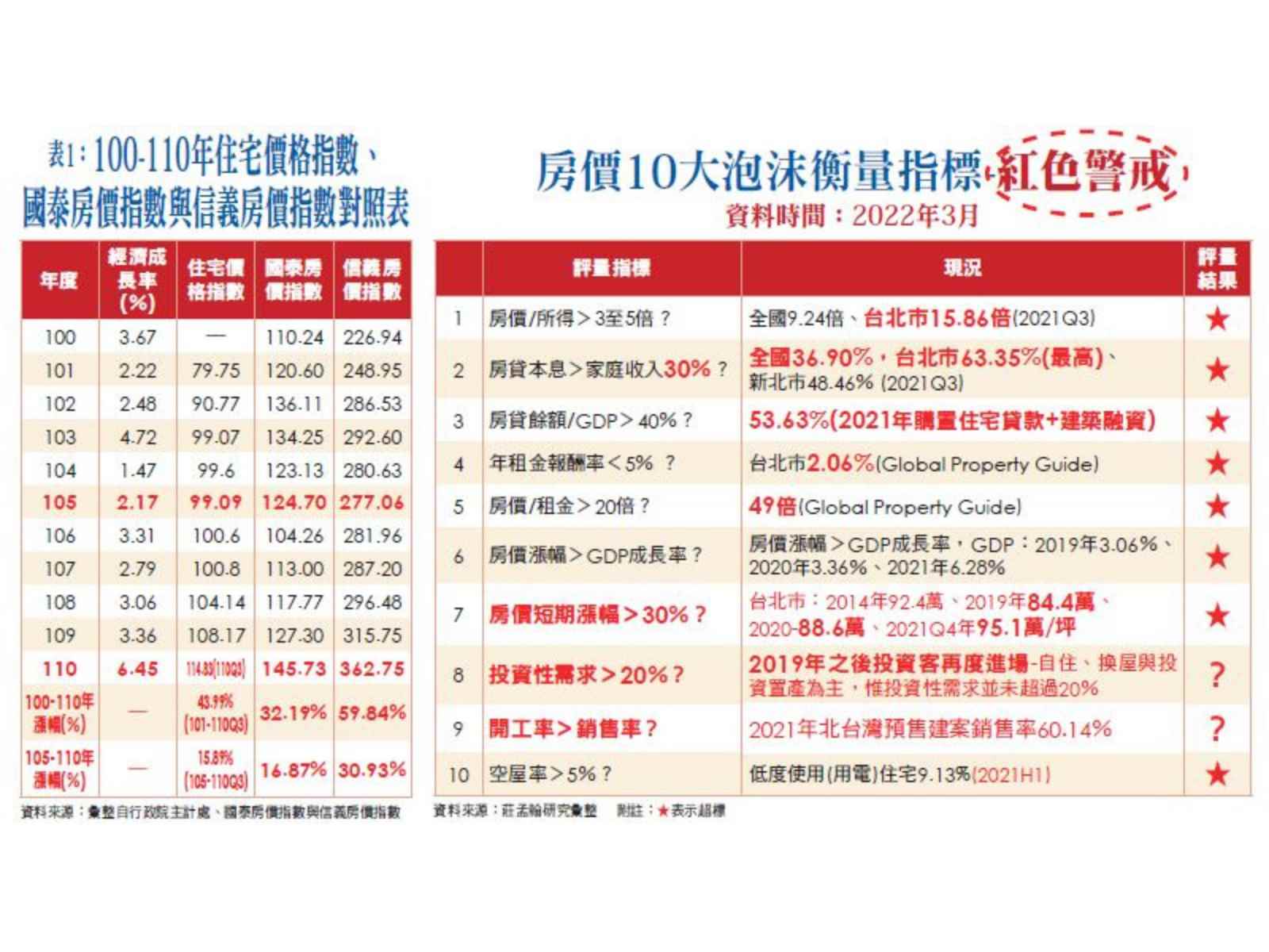 有關此一議題,可就內政部公布之住宅價格指數、預售屋之國泰房價指數與中古屋之信義房價指數五年來與十年來漲幅,分別與GDP成長率相互對照,即可清楚了解房價漲幅是否大於GDP成長率之衡量指標超標情況。