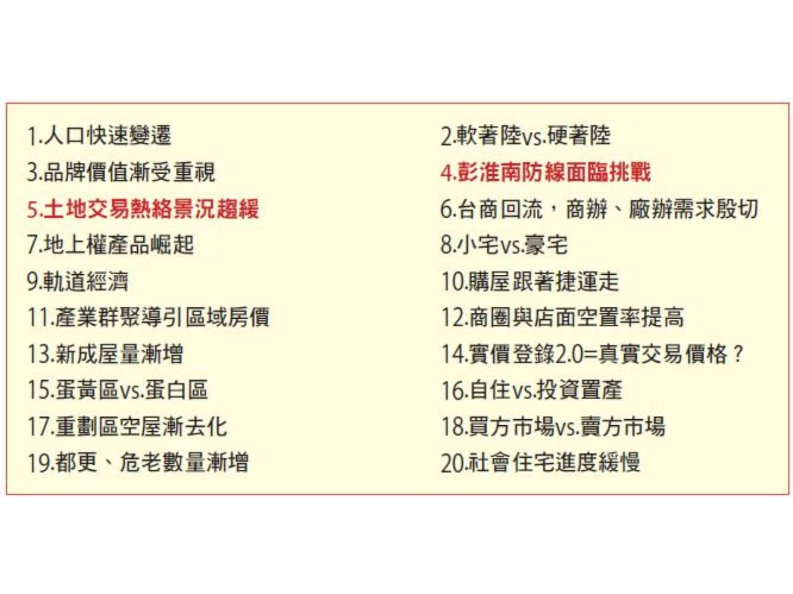 另外,就房地產市場而言,每當房價大幅飆漲,最常被社會大眾津津樂道的便是「一坪300萬元的彭淮南防線」,其次,便是引導房市朝軟著陸趨勢發展。