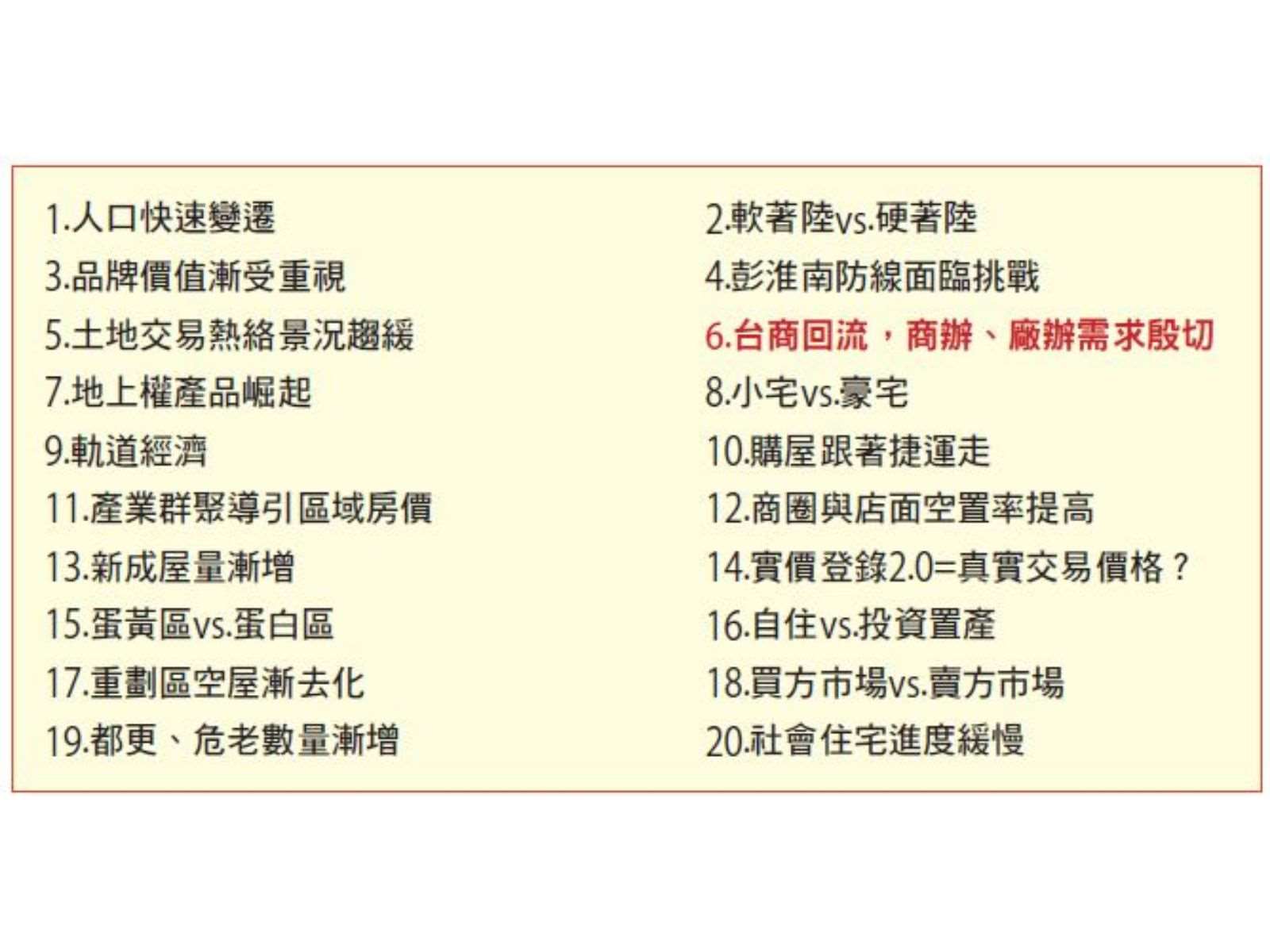 隨著台商大量回流,再加上外資加碼投資,尤其是各地方政府積極招商引資並加速交通建設,未來三至五年在產業不斷擴廠投資情況下,除商用不動產之外,連帶住宅產品亦有相當大的發展空間。