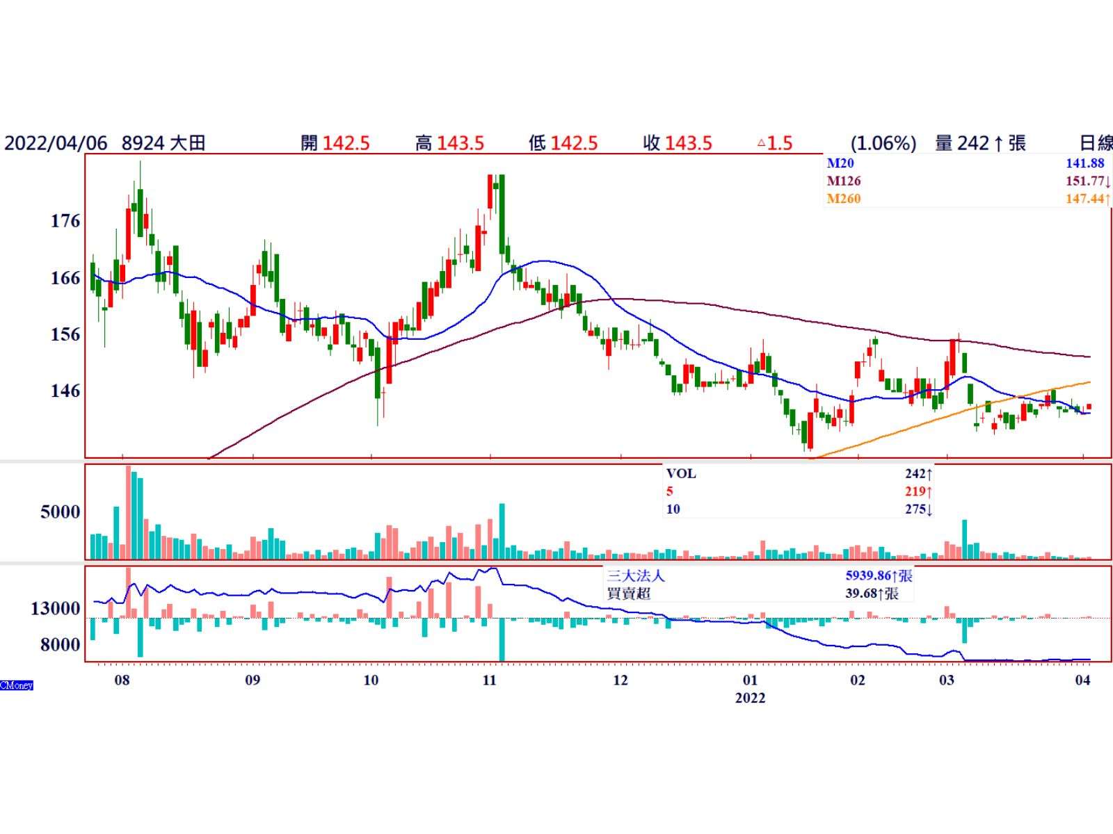 大田去年八月股價一度達186.5元,之後長達九個月都維持箱型橫向整理,介於186元至140元間,尤其最近四個月股價只於155~140元間小幅度震盪,未來只要155元突破,有機會走出一波新的多頭行情。