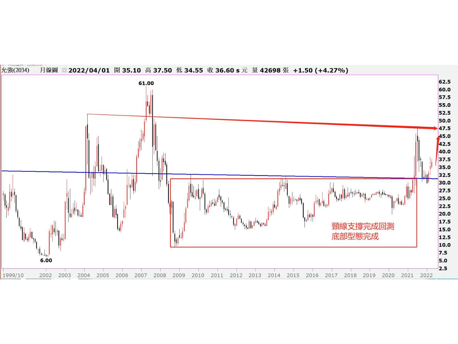 今年三月的「妖鎳」之亂,推動股價從33元漲到38.25元,漲幅達15.9%,但因停券到四月十三日,近期股價漲幅相對落後同族群的彰源、大成鋼、新光鋼,用正常的K線圖來看,30元以下已構成2009年以來的長期底部型態,在地緣政治衝突、通膨居高不下的年代,高盛所謂的原物料的超級週期牛市還在初期階段。