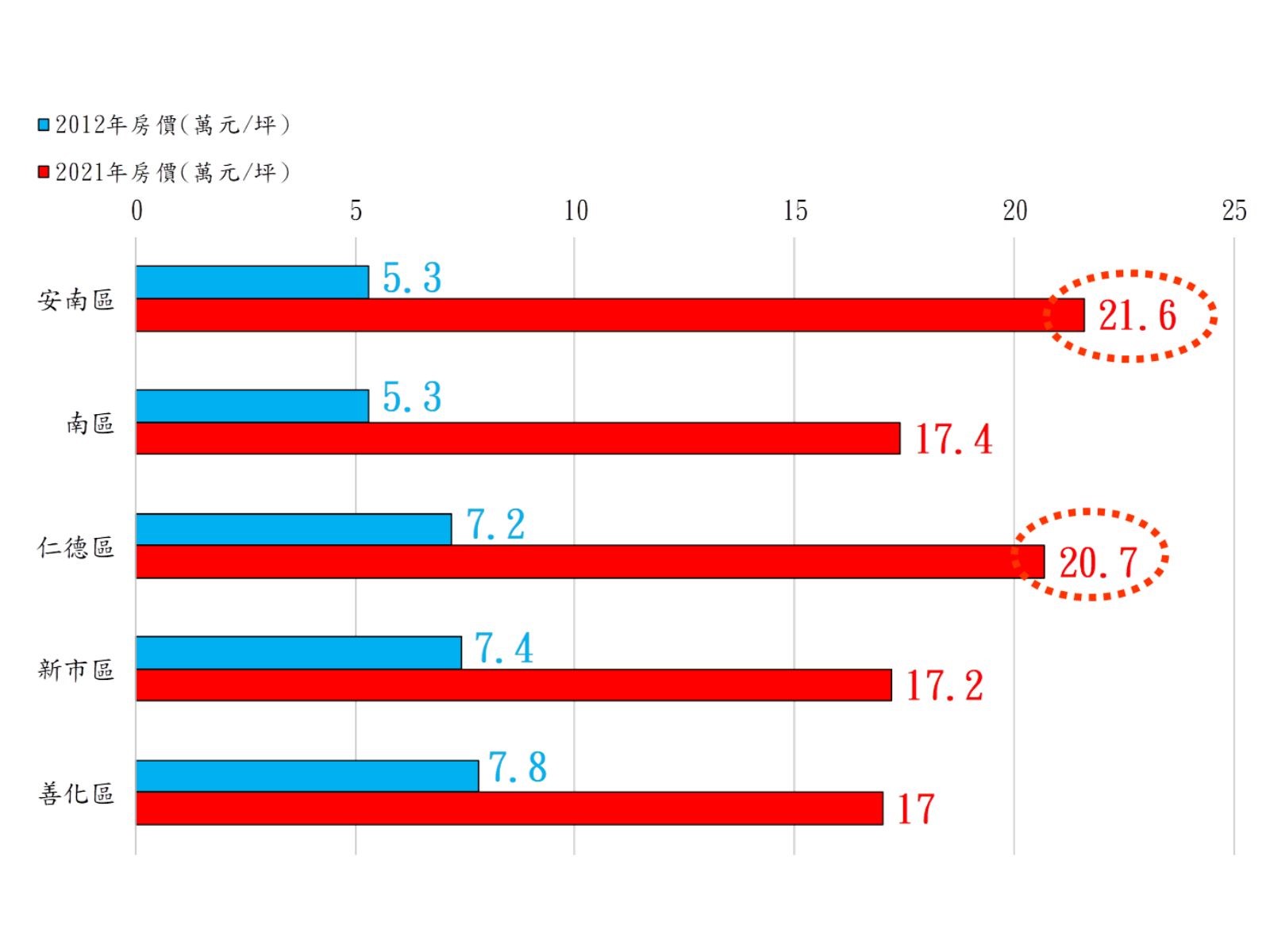 近年由於台南市房價持續大幅飆漲而備受關注,根據591彙整實價登錄資訊,近十年台南市房價平均漲幅高達189%,其中安南區從2012年每坪5.3萬一路飆漲至2021年21.6萬,漲幅高達307.5%,南區從每坪5.3萬漲至17.4萬元,漲幅228.3%,仁德區從每坪7.2萬漲至20.7萬元,漲幅187.5%,新市區從每坪7.4萬元漲至17.2萬元,漲幅132%,善化區由7.8萬元漲至17萬元,漲幅亦高達117%(詳請參閱附圖),由此不難了解主管機關對於台南市房價持續大幅飆漲備加關注之主要緣由。