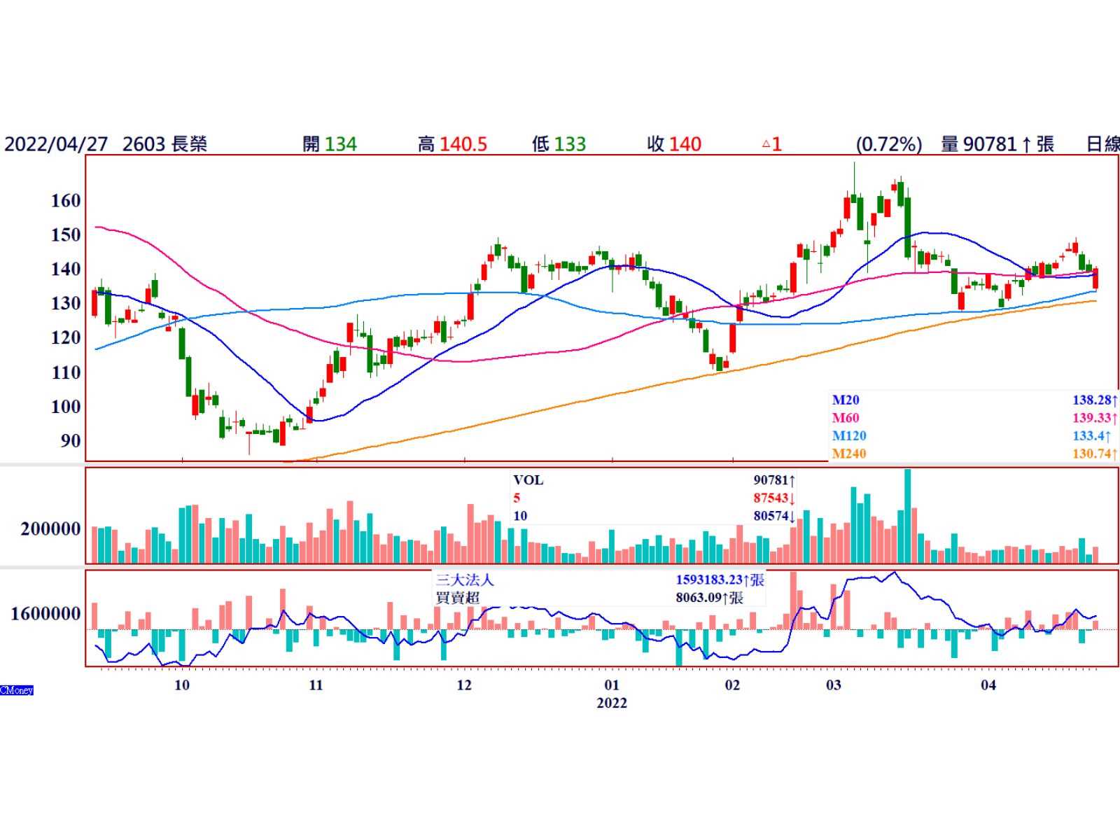 接下來五月中前,上市櫃公司將完全公布第一季財報,長榮第一季營收年增89.9%,陽明第一季營收年增71.3%,第一季保守每股估賺16~18元,應該可輕鬆達標。