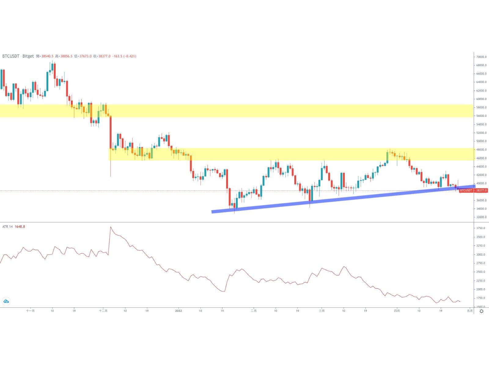接著我們回來觀察比特幣的價格走勢,先從技術層面來觀察,比特幣幣價維持在三萬三至四萬八的大底部區間內震盪整理。三月底時挑戰頸線失敗,因此上緣的壓力將變得更為沉重,加上在大環境不佳的情況下,就更難吸引大量資金推升幣價。在巨鯨持續蒐集籌碼的情況下,短線先看三萬八的支撐,幣價進一步大跌的機會不高。