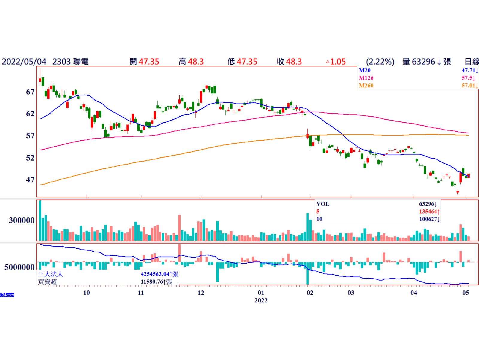 聯電今年配息三元現金,以5/4收盤價48.3元計算,殖利率高達6.2%,本益比只有六倍。股價去年九月一度漲到72元,之後在外資大舉賣超台股情況下,今年四月最低跌到43.55元,回到一年半低點,近日在首季財報發布後股價出現強力回升,最近外資買超台股動作不大,聯電暫時會維持築底行情,年線57元及半年線57.5元形成最大壓力區。