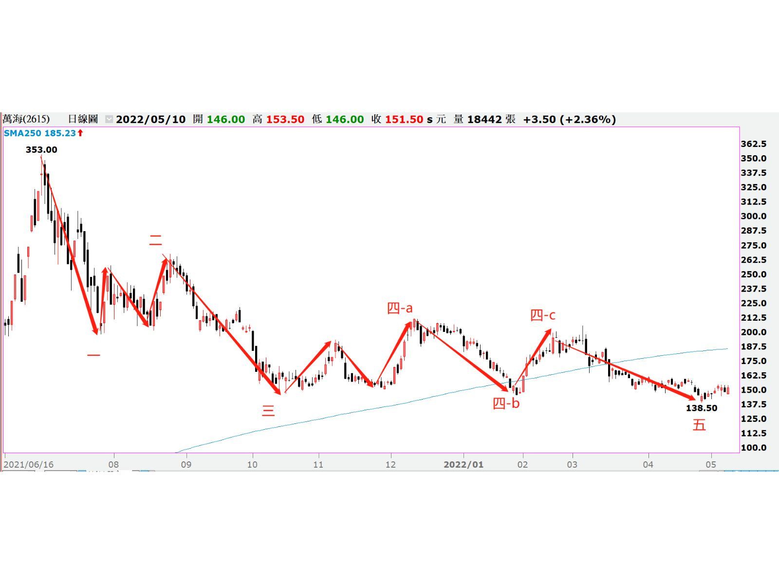 從這個角度來看,陽明的83.6元低點出現在2021年10月25日,之後有明顯的三波反彈。同樣的情況,長榮的85.5元低點出現在去年10月18日,也是有三浪反彈,只有萬海的138.5元低點出現在今年4月27日,可以說還沒有進入到三浪的B波反彈,參考長榮與陽明股價都守在年線之上,萬海股價距離年線的負乖離高達-26.59%。
