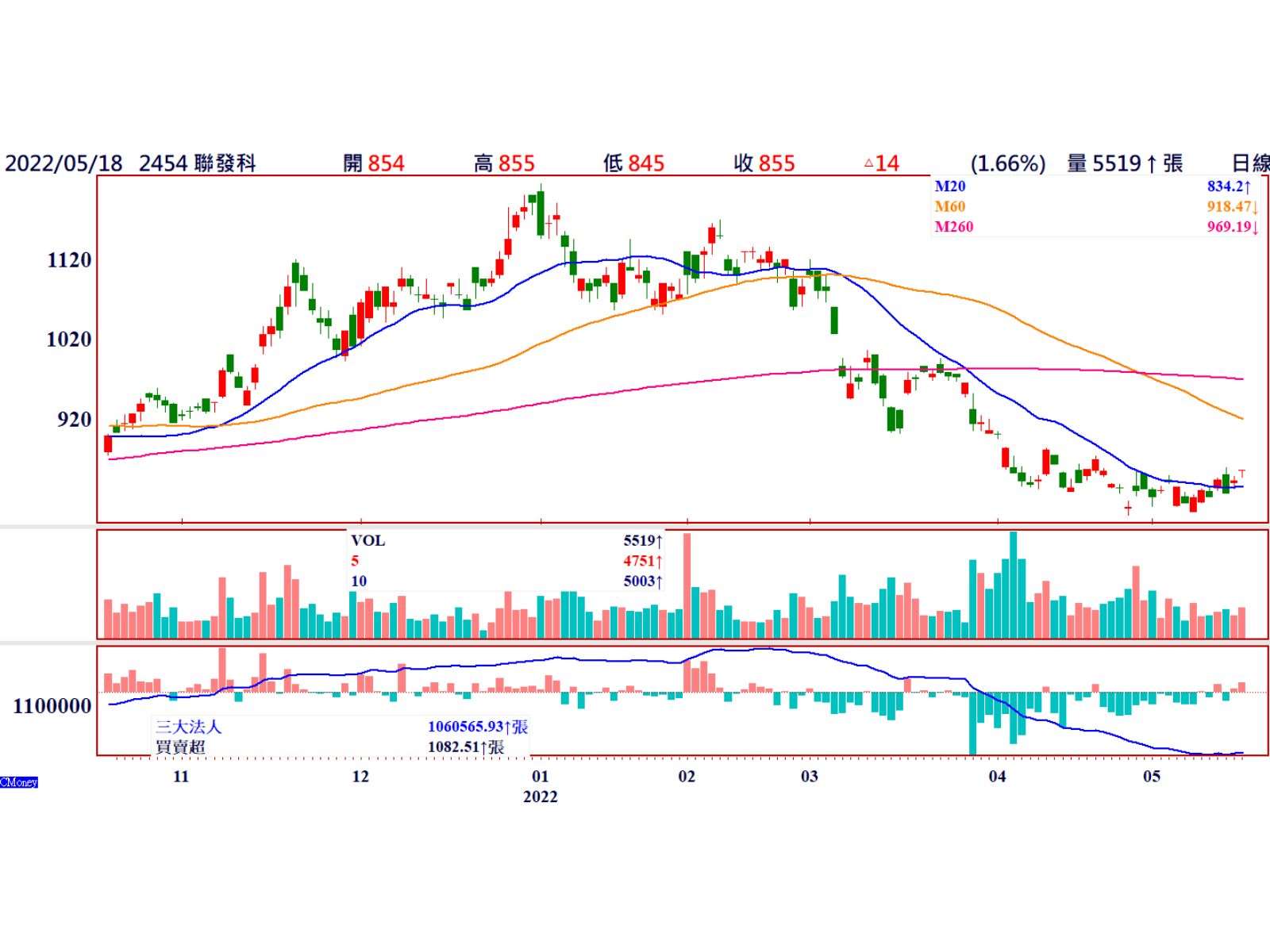 聯發科去年EPS 70.56元,將配發73元現金。公司配息一直都很大方,以五月十八日收盤價855元計算殖利率8.5%,在千金股中絕無僅有的配息高殖利率股。法說會上預估:今年會逐季成長,估計全年EPS會超過85元以上,本益比只有十倍。今年股價一度跌到797元,近兩個月已經即將完成「弧形底」,頸線880元如果站上,就有機會回測年線970元。