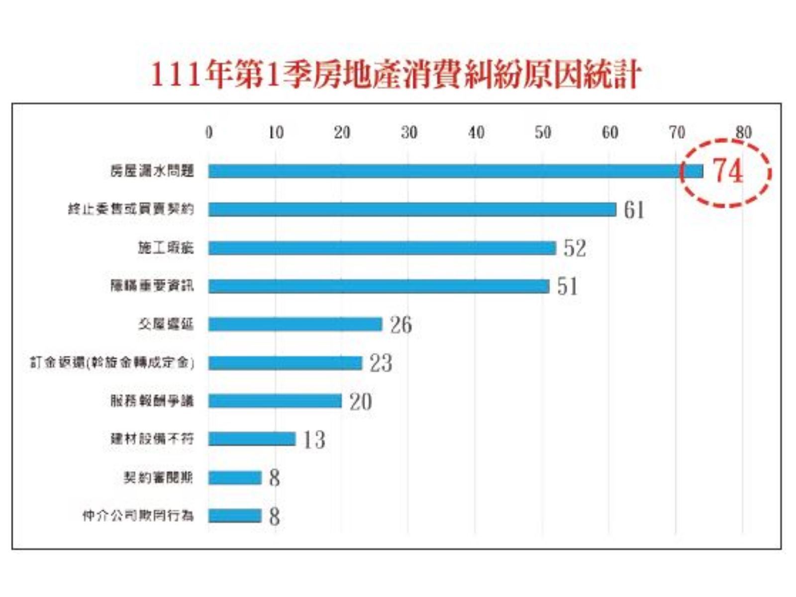 根據內政部不動產資訊平台所公布111年第1季房地產消費糾紛原因統計,房屋漏水排名第一,交屋遲延排名第五位(詳請參閱附圖),可以想見的是,三、四年來在持續缺工、缺料情況下,預售屋逾期完工情事必將愈來愈嚴重;此一問題同樣發生在都更或危老建案,由此不難了解,雖然內政部一再表示逾期完工已違反預售屋買賣定型化契約規定,惟此一問題並非全因建商單一因素所導致,因此,未來逾期完工與遲延利息等購屋糾紛勢必愈來愈嚴重。