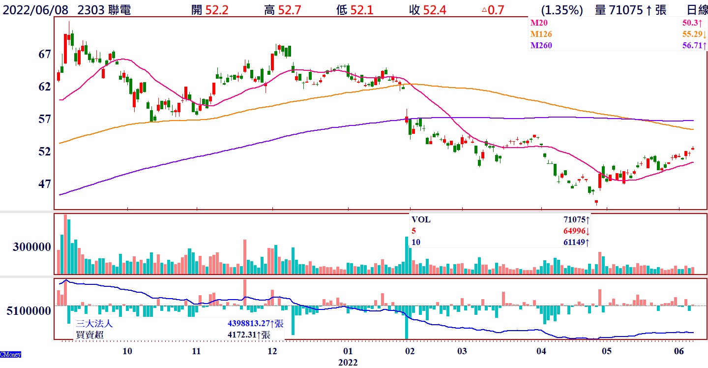 聯電將於6/22除息配三元現金,以6/8收盤價52.4元計算殖利率高達5.7%。股價去年九月一度漲到72元,之後在外資大舉賣超台股情況下,今年四月最低跌到43.55元,回到一年半低點,近日在首季財報發布後股價出現強力回升,漲幅達21%,五月外資累計買進22萬張是上市櫃最多,年線56.7元及半年線55.5元形成最大壓力區。