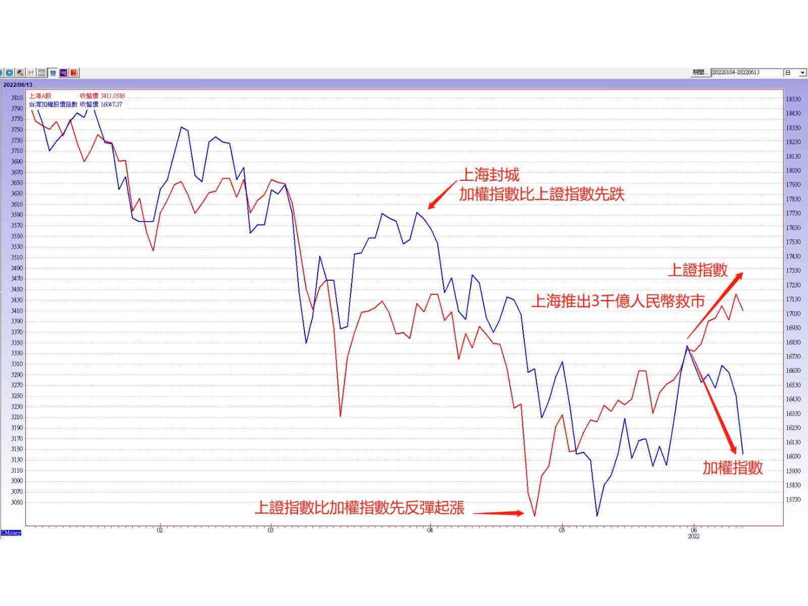 再來看看道瓊指數,在三月底蘋果下修第二季iPhone二成出貨量起,消費縮手、打庫存的利空就困擾著科技股,六月九日道瓊指數收盤32272.79點,距離三月三十日的35228.8點收盤價,累積-8.39%跌幅,在聯準會宣示未來兩次FOMC例會將分別升息二碼,繼續緊縮貨幣對抗通膨,對照中國大陸官方正祭出救市措施,過去一個月透過滬港通、深港通等北向資金累積達488.68億元人民幣。