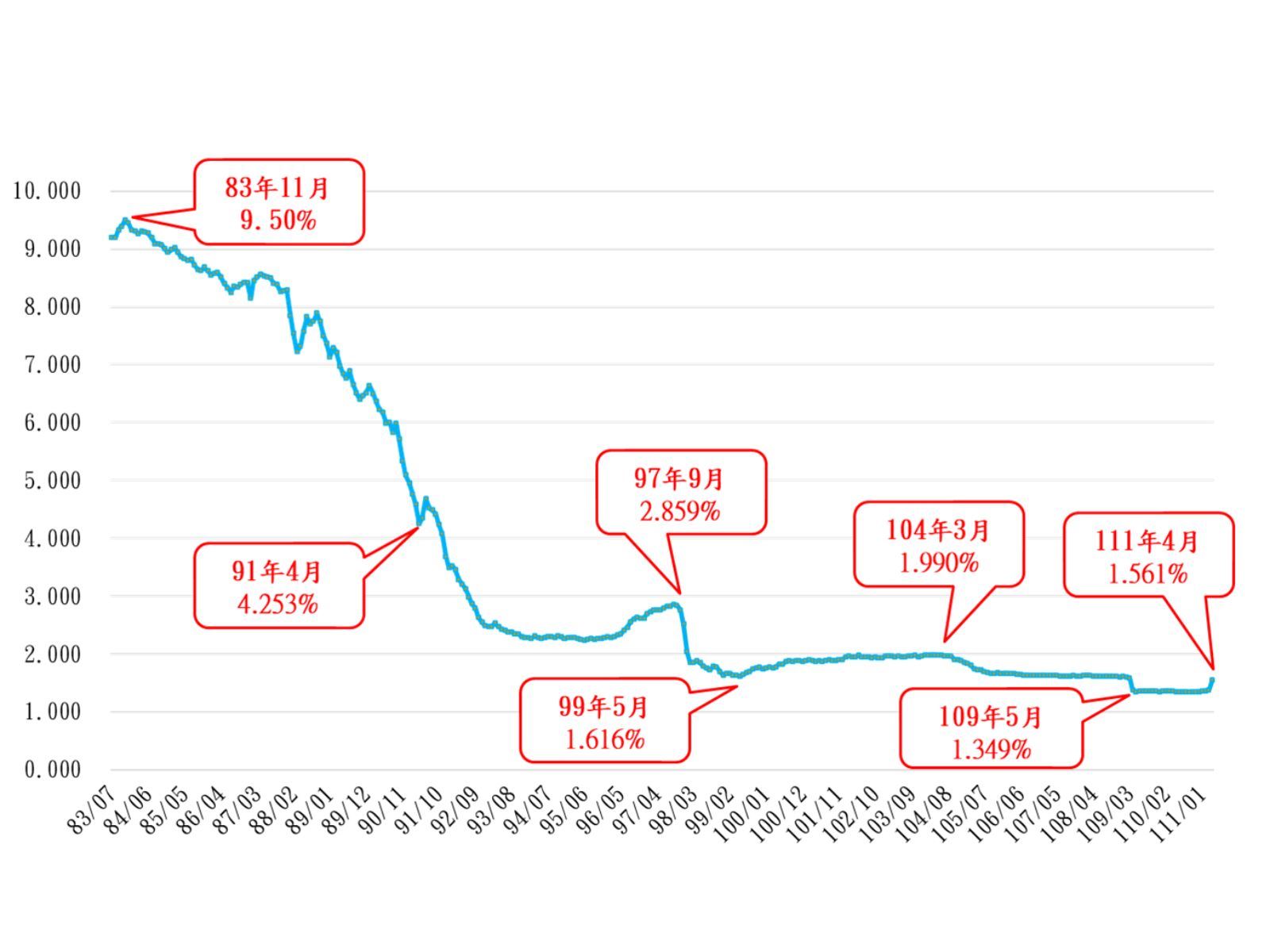 央行自2020年12月推出選擇性信用管制以來,不僅購屋貸款成數大幅調降,並且對於土地融資也大幅限縮,惟五大銀行(台銀、合庫銀、土銀、華銀及一銀)新承做放款利率始終處於低檔,及至2021年12月仍處於1.355%,2022年4月方才隨著美國升息而調升至1.561%(詳請參閱附圖),在長期低利率情況下,房市投機炒作從未止歇,惟自2020年開始變本加厲的促使房價不斷飆漲;主管機關方才連續啟動四波打炒房措施,並且以房地合一稅2.0重稅以及聯合稽查重罰違規交易,最近則因美國升息,直接衝擊股市與房市景氣。