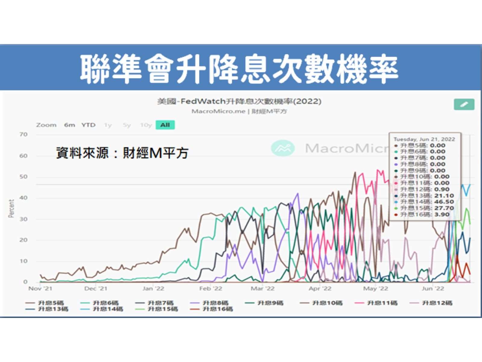 今年還有四場利率會議,比較可能的路徑是七月升息三碼、九月升息二碼、十一月與十二月各升息一碼,全年的利率預測,由三月的1.9%,大幅上調到3.4%!