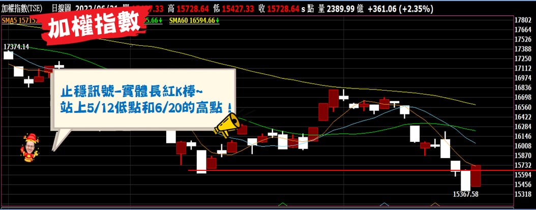 加權指數如上期周刊提到,站不上16300,月線、頸線、缺口壓力將是另一段鬼故事的開始,短短幾天,行情又回檔殺了一千點,融資在6/16-6/20這三天大幅減肥188億,殺出恐慌後,加權指數於6/21大漲了361點,實體的長紅K棒,不僅站上前波低點15616,也站上6/20高點15667,出現一止穩訊號,三日不跌破,行情有機會往15900-16100靠攏,然這個反彈波不容易走V轉,而是用反覆震盪的方式,大家要做好部位控管,因為同樣的事,或許七月會再來一次!