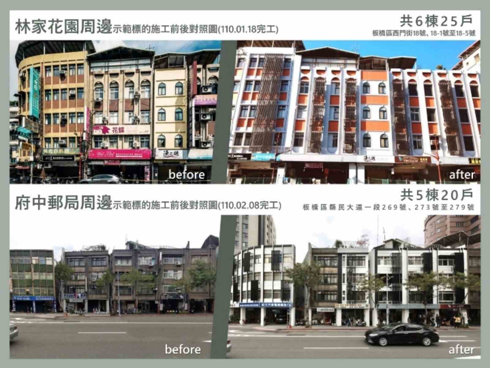 1.在新北市府積極推動都更三箭第二箭之「主要幹道沿線環境優化」政策下,首創公辦整建維護,篩選林家花園周邊、府中郵局周邊、漢生東路街口、南雅公園周邊與縣民大道二段五處為示範標的,初步效果顯著,值得肯定。