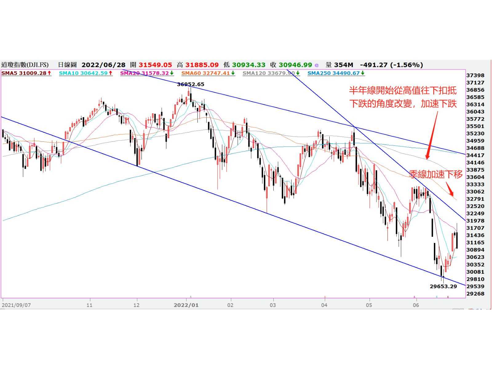 是的,隨著時序進入到半年報公布期,美股的反彈越來越弱,從道瓊指數的K線圖可發現,半年線的扣抵值正好落在一月五日的36952歷史高點,之後將加速下移,因此從K線圖上可看到半年線下跌的角度改變為較向下傾斜,意思是隨著時間增加,33679點以上的套牢壓力越來越重,恰巧季線的扣抵值正好落在四月一日上海封城的34818點。